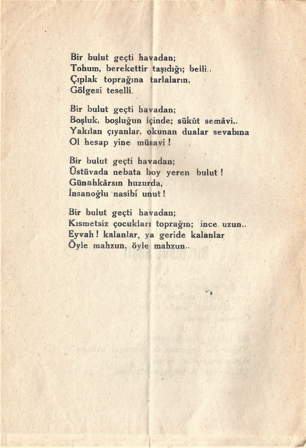 Kitaba adını veren şiiri Bir Bulut Geçti (el ile yapılan düzeltme o zaman matbaa ya da kendisi tarafından yapılmıştır):